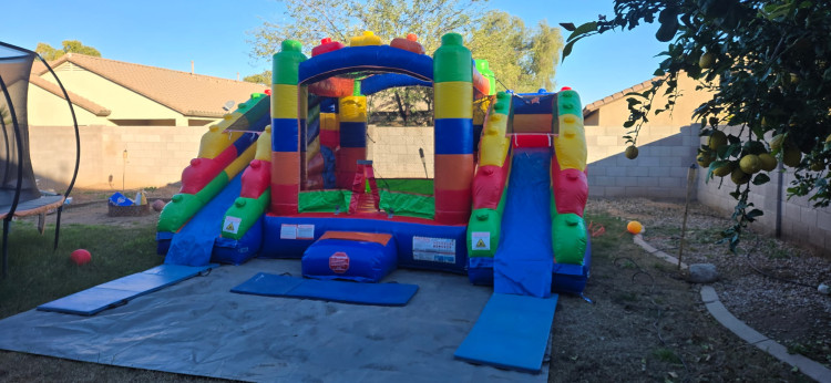 - The DOUBLE SLIDE BLOCKS bounce house is full of fun!